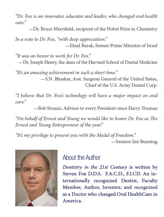 Dr. Fox is an ICON in the dental profession. In partnership with the United States Government and the American Dental Association, he developed many of the products used in oral care today. He is nationally and internationally recognized for revolutionizing oral care. Dr. Fox employed a Nobel Prize winner in Chemistry, The Asst. Surgeon General of The United States, and The Dean of The Harvard School of Dental Medicine.